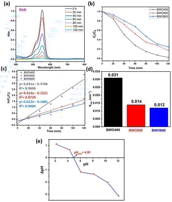 UV-vis absorption spectra of RhB under solar light illumination on BWO400 (a), the variation of Ct/C0 with illumination time on BWO400, BWO500, and BWO600 (b), fitted pseudo-first-order kinetics for the photodecomposition reaction along with the corresponding rate constants (c,d), and the identification of point of zero charge (pHpzc) of BWO400 (e).