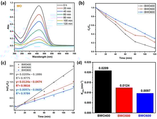 To ensure the photocatalytic performance of BWO prepared at various calcination temperatures, another experiment was carried out on the decomposition of an organic dye like methyl orange (anionic dye). Figure 8a reveals that under UV illumination, the intensity of the contaminant absorption band (465 nm) declines with illumination time in the presence of BWO as prepared by the co-precipitation method and thermally treated at 400 °C. In addition, Figure 8b shows plots describing the variation in Ct/C0 of the MO versus illumination time for the different photocatalysts (BWO400, BWO500, and BWO600). Similar to RhB, the results obtained for MO show that the degradation efficiency decreases with the switch from BWO400 to BWO600. In particular, the BWO treated at 400 °C displayed superior photocatalytic performance, with a decomposition efficacy of 92% in 120 min, while the BWO500 presented an efficiency of 78%, and the decomposition efficiency for the BWO600 was 70% during 120 min of irradiation. Figure 8c indicates that the photocatalytic reaction obeys a pseudo-first-order kinetic. The determined rate constants kobs are given in Figure 8d. Their values are 0.0209, 0.0124, and 0.0097 min−1 for the BWO400, BWO500, and BWO600 photocatalysts, respectively. In addition to the optical characteristics, especially the gap energy and the PL readings, which show that BWO400 is more favorable for the degradation of MO, the achievement of this degradation efficiency (92%) can also be explained by the surface charge. In our reaction medium, the pH of our system is around 5.8, which is above pHpzc (Figure 7e), so the BWO is negatively charged leading to a repulsion between the negatively charged MO molecules and the negatively charged BWO. This will result in a decrease in the pH of the medium toward a pH value lower than the pHpzc and consequently the surface charge of BWO400 becomes positive. Consequently, the decomposing process is highly efficient owing to the electrostatic attraction occurring between the positively charged surface of the catalyst and the negatively charged dye molecule.