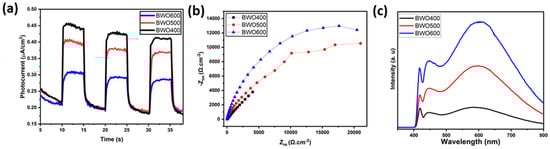 The transient photocurrent curves of BWO400, BWO500, and BWO600 (a), EIS Nyquist graphs (b) and the photoluminescence PL curves (c) of each photocatalyst (BWO400, BWO500, and BWO600).