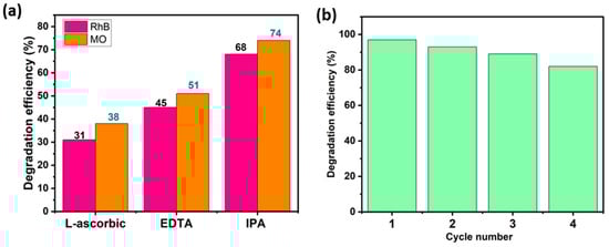 Trapping studies were conducted out to identify the principal oxidizing species that are involved in dye decomposition. Ethylene-Diamine-Tetra-Acetic acid disodium (EDTA), L-ascorbic acid (L-asc), and Isopropyl Alcohol (IPA) were used as specific and appropriate scavengers of the species likely to be responsible for MO and RhB decomposition, i.e., OH•, O2•− and holes h+. Figure 10a illustrates the impact of these trapping agents on the photocatalytic performance of the BWO400 photocatalyst with respect to RhB and MO. As can be seen in this figure, the photocatalytic breakdown efficiencies are 97% and 92% for RhB and MO, respectively, in the absence of scavengers. With the addition of L-ascorbic acid, EDTA, and IPA, these efficiencies dropped to 31%, 45%, and 68% for RhB and 38%, 51%, and 74% for MO, respectively. Therefore, it may be deduced at this stage that superoxide O2•− and holes h+ are considered to be the principal species responsible for the photodecomposition of MO and RhB, while hydroxyl radicals OH• are found to play a secondary function in the photocatalytic degradation. These results are similar to those of Wang et al. [63], who reported that O2•− and h+ are the major species implicated in process decomposition.