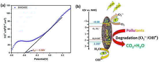 To better explain the photocatalytic process, the valence band (VB) and the conduction band (CB) positions of the BWO400 were measured using Mott–Schottky (MS) analysis (Figure 11a). The MS formula is expressed below: