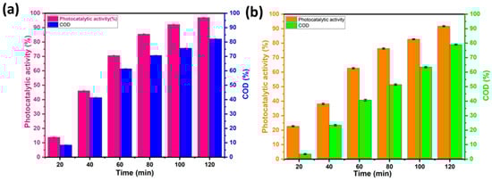 The mineralization of the cationic dye (RhB) and anionic dye (MO) during photocatalytic reaction has been assessed through measuring the chemical oxygen demand (COD). RhB and MO photodecomposition tests were conducted in a 100 mL beaker at ambient temperature. The COD was measured by using a Lovibond COD kit (Dortmund, Germany), and the results were obtained using an MD 200 COD spectrophotometer. The rate of photodecomposition was defined as CODt/COD0 vs. time. The rate was computed for different photocatalytic reaction times according to the following equation: