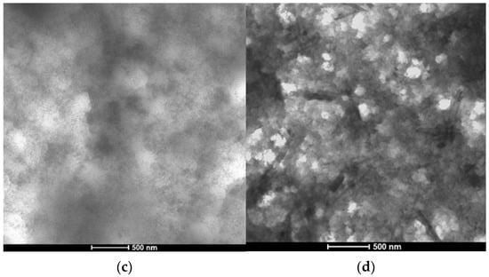 Exemplar TEM images of: (a) ES/MC, (b) ES/HC, (c) HM/MC, and (d) HM/HC composites at 2.5% concentration.