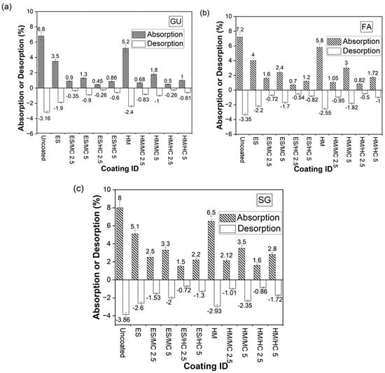 Absorption and desorption percentages of concrete specimens from the (a) GU, (b) FA, (c) SG groups. (Note: All data are listed in Appendix Table A1).