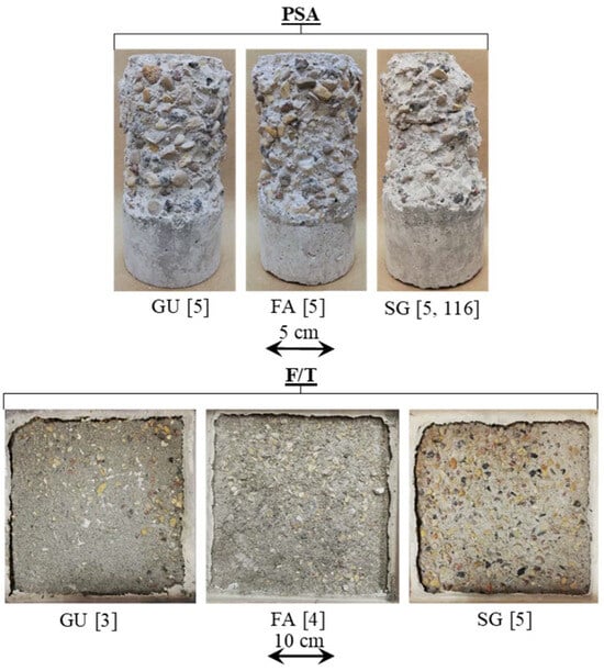 Figure 3 displays the visual condition of untreated specimens after the PSA exposure, and Figure 4 shows the various visual state of untreated and treated SG specimens after exposure since they suffered the most damage; specimens were evaluated visually according to a pictorial visual rating scale proposed by [34]. In addition, the cumulative mass variation (gain or loss) of specimens after the PSA exposure, and detailed data measured every 30 cycles of exposure are given in Figure 5a–c and Appendix (Table A2), respectively. All damaged specimens had an intact submerged portion in salt solution and lost mass only from upper portions, which is a typical feature of PSA [38]. Deterioration proceeded progressively where salt depositions accumulated on and below the surface layer in the drying part (above solution) of specimens, followed by scaling and peeling that layer to an extent determined by the type of base mixture and coating. Reference/uncoated specimens of the three mixtures yielded the greatest damage, with all specimens having a visual rating of 5 (max. level); using high contents of SCMs (40% FA or 60% SG) increased the vulnerability of specimens for damage. The final mass loss for GU, FA, and SG specimens was 12.2%, 15.8%, and 20.2%, respectively, with SG specimens fractured after 116 cycles.