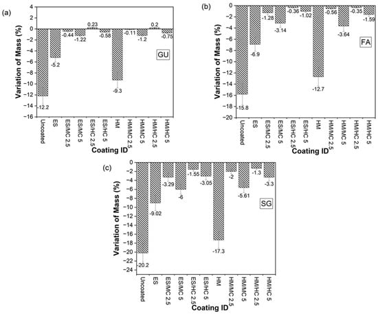 Regarding HM/nanocomposites, GU treated with HM/HC2.5 was the sole matrix that remained intact (visual rating of 0 and no mass loss) until the end of exposure. Their counterparts of FA and SG exhibited mass losses of 123 and 245 g/m2, respectively. In contrast to ES, changing the nanoparticle type with HM (i.e., MC instead of HC) led to substantial spalling (roughly three times) and demonstrated statistical significance, as indicated by the ANOVA (Table 4). For GU specimens, the application of HM/MC2.5 relative to HM/HC2.5 resulted in an F-value of 261.4 compared to a critical threshold (Fcr) of 18.51. Increasing nanoparticles to 5% significantly impacted the effectiveness of nanocomposites against these harsh conditions for both nanoparticle types. Within the HM/nanocomposites group, samples treated with HM/MC5 showed maximum final mass losses of 316, 853, and 1215 g/m2 for GU, FA, and SG, respectively, indicating inadequate protection for the FA and SG concrete.