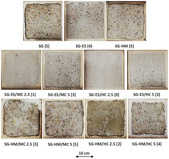 Uncoated and coated SG specimens at the end of the salt–frost scaling exposure (Note: numbers between brackets are the final visual ratings).
