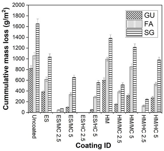Incorporating nanoparticles into neat coatings significantly enhanced concrete resistance against this exposure. For instance, compared to pure ES, all slabs coated with ES/HC2.5 remained completely intact (visual rating of 0) throughout the exposure with zero mass loss irrespective of mixture type. Similarly, replacing HC with MC yielded the same outcome for GU, while minimal mass losses (less than 71 g/m2) were observed for FA and SG, indicating remarkable improvements. Similar to the trends observed under the PSA exposure, increasing the nanoparticle dosage to 5% reduced the efficacy of nanocomposite functionality, particularly with FA and SG, demonstrating statistical significance when compared to samples coated with nanocomposites at a 2.5% loading ratio (Table 4). For example, the final mass losses of slabs coated with ES/MC5 were 97, 338, and 654 g/m2 for GU, FA, and SG, respectively.