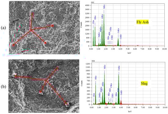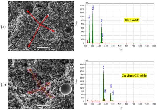 In the case of PSA, both fly ash and slag exhibited increased mass losses of 30% and 66%, respectively, compared to GU specimens, with slag samples fracturing before the exposure concluded. During salt–frost scaling exposure, due to the ease of salt solution ingress and the readiness of unbonded particles to detach, FA and SG showed higher surface scaling and total mass losses (increases of 28% and 100%, respectively) compared to GU. Figure 10 illustrates salt crystals filling voids previously occupied by loose fly ash particles, which easily dislodged. Moreover, within the deteriorating zone (0–10 mm) from the surface, significant amounts of thenardite (sodium sulfate) in PSA and calcium chloride in salt–frost scaling crust layers were detected, which were primarily responsible for the progression of damage.