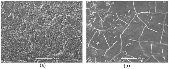 SEM images for surfaces of unexposed GU specimens coated with (a) ES and (b) HM.