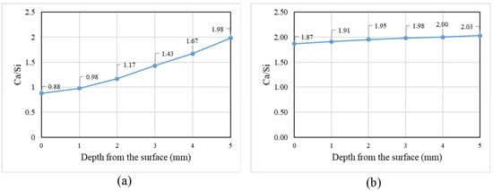 Ca/Si curves representing the first 5 mm of GU samples coated with (a) ES and (b) HM.