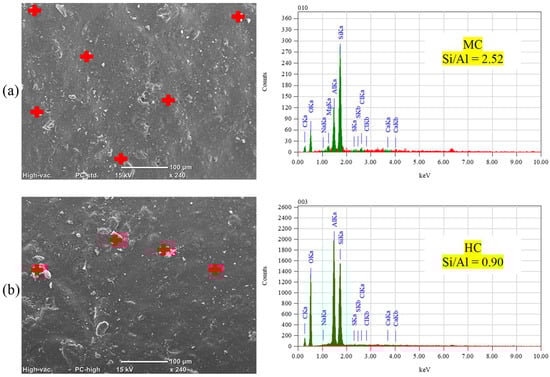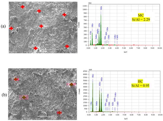 SEM and EDX analyses for surfaces of GU specimens coated with (a) ES/MC 2.5 and (b) ES/HC 2.5.