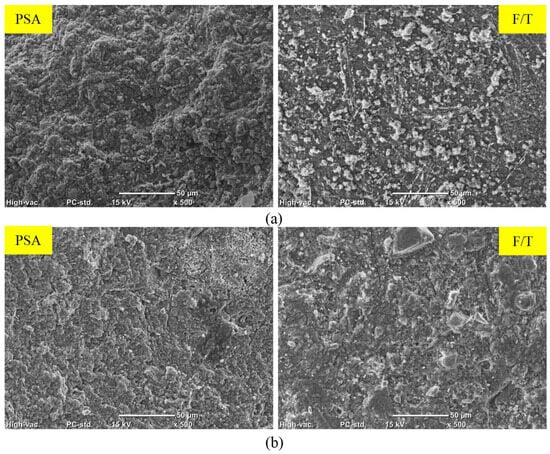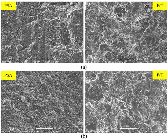 SEM and EDX analyses for exposed FA specimens: (a) PSA and (b) F/T.