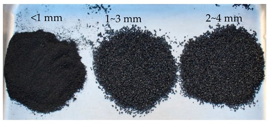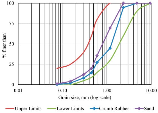 Commercially available mechanically shredded waste tire particles (sizes < 1 mm, 1–3 mm, and 2–4 mm) were used in this study. A volumetric replacement method was applied to replace natural sand with crumb rubber. Three different particle sizes of CR were mixed to obtain a well-graded blending of fine aggregate. The mix ratio of < 1 mm, 1–3 mm, and 2–4 mm CR particles was 8:7:5 (by volume). Figure 1 represents the CR particles used in this experimental research. Sieve analysis was carried out as per AS 1141.0-1999, 1974 [45]. The produced particle size distribution curve is presented in Figure 2. The figure also demonstrates the particle size distribution curve of riverbed sand while showing the upper and lower limits of well-graded fine aggregates. Upper and lower limits for the particle gradation requirements were set by AS 2758.1 [46].