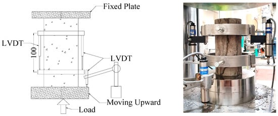 All the tests were conducted at the main civil engineering lab located at the University of New South Wales at the Australian Defence Force Academy. A standard compressive strength test was carried out following the Australian standard AS 1012.9 [51]. Standard cylinders of 200 mm height and 100 mm diameter were used for all tests. Stress–strain behaviour of the test specimens was recorded with a careful setup of two Linear Variable Displacement Transducers (LVDT) on both sides of the specimen. An average strain of these two LVDTs was used as the strain of the specimen, and the gauge length was 100 mm. LVDTs used in these experiments were able to record a movement of 0.001 mm. A third LVDT was used to control the movement of the loading plate. The experimental setup unconfined specimen is shown in Figure 7.