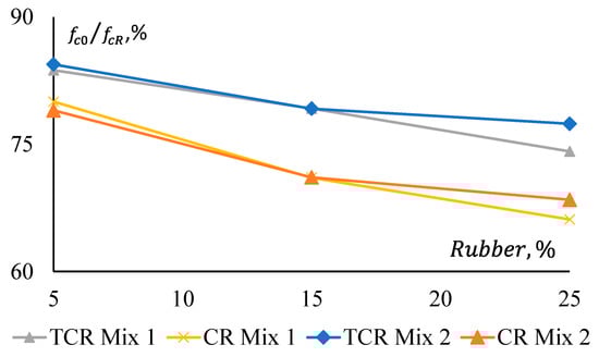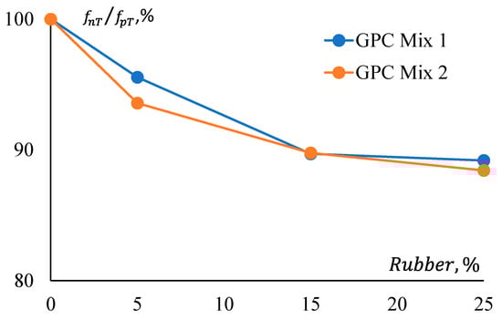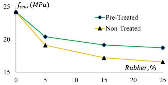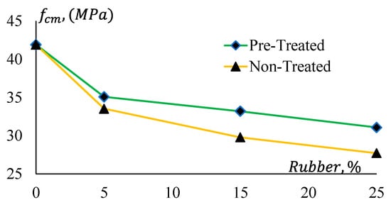 Figure 11 shows that pre-treatment of rubber has a relatively consistent effect on the strength reduction of both GPC Mix 1 and Mix 2. All CRGPC mixes show a consistent difference in the reduction of their compressive strength for pre-treated and non-treated rubber. Here, denotes the compressive strength of non-treated rubber GPC, and denotes the compressive strength of pre-treated rubber GPC.