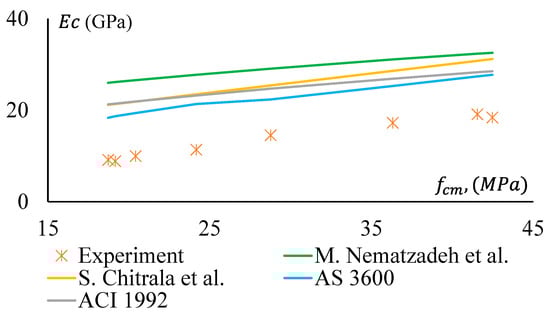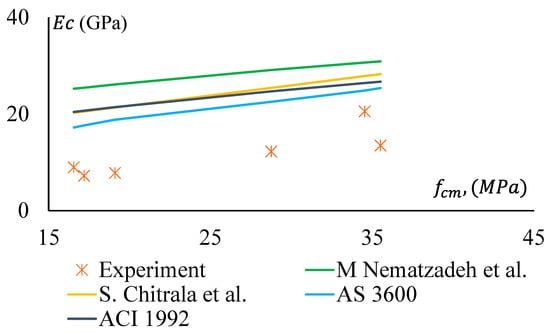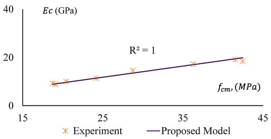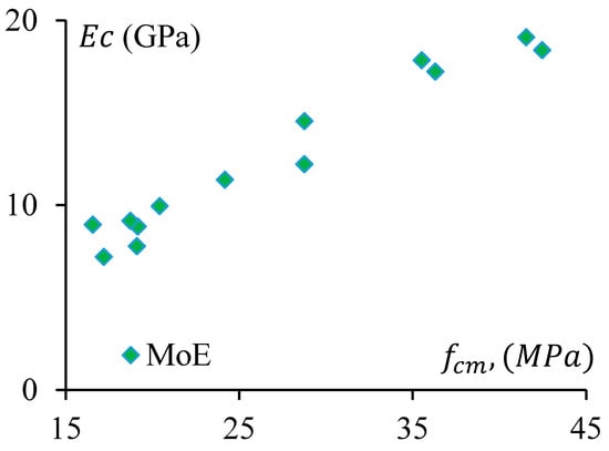 The stiffness of a material depends on the elastic modulus, , of that material. It is a crucial parameter for concrete/geopolymer. The Modulus of Elasticity (MoE) is required to analyse the deflection and seismic performance of concrete structures. In this study, MoE is determined as the secant modulus measured at the 40% stress level of the average compressive strength of a concrete specimen. The MoE of the specimens were obtained from stress–strain curves of the representative samples and presented in Figure 13, which clearly shows that MoE (Ec) of the GPC and CRGPC concrete has a trending relationship with the compressive strength (fcm) of the concrete. The MoE of GPC mixes is determined based on the average MoE of three specimens of the same batch of concrete from the same mix. The MoE values of the different mixes are presented in Table 8.