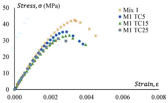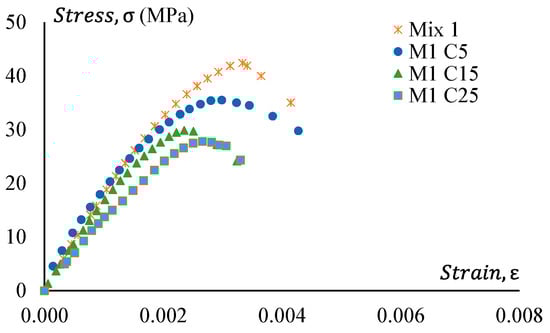 Stress–strain curves of all GPC and CRGPC mixes are shown in Figure 14, Figure 15, Figure 16 and Figure 17. Figure 14 shows the stress–strain curve of Mix 1 and various mixes of treated CRGPC originating from the core Mix 1. The result shows that with the increase of rubber content in the mix, the overall strength of the concrete decreases. A decrease in peak strain at the peak load is also noticed, along with the increase in rubber content.