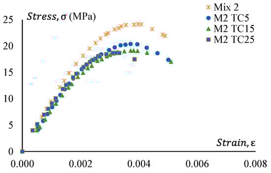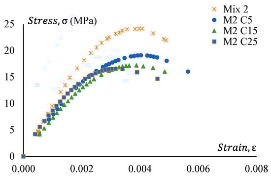 Figure 16 shows stress–strain curves of GPC Mix 2 and a treated CRGPC variation of Mix 2. Figure 17 presents the stress–strain relationship of Mix 2 and various mixes of non-treated CRGPC originating from the core Mix 2. The strain value at peak stress of Mix 2 and CRGPC variations of Mix 2 are presented in Table 10.