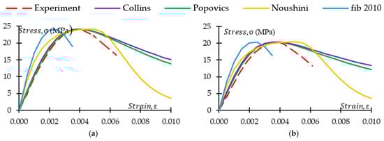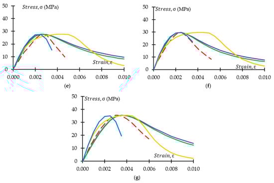 Strain at peak stress plays an important role in predicting the stress–strain behaviour of GPC and CRGPC. It is observed from Figure 25, Figure 26, Figure 27 and Figure 28 that when the strain value at peak stress for the fib 2010 model is replaced with the experimentally obtained value, it matches well with the experimental stress–strain behaviour of GPC and CRGPC. Due to a lack of data, a model to predict strain at peak stress was not developed.