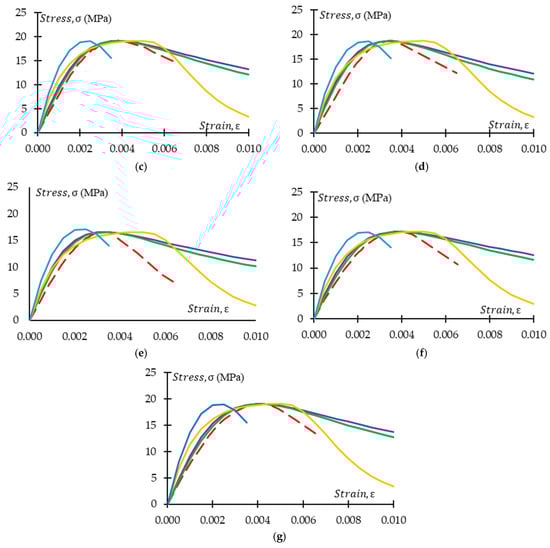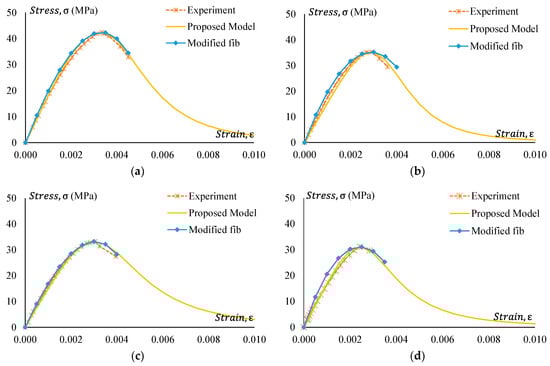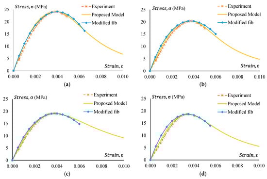 Figure 25, Figure 26, Figure 27 and Figure 28 present a comparison of the stress–strain relationship between experimental results and the proposed model. It is observed from the mentioned figures that the proposed stress–strain model fits well with the experimental data. To check the suitability of the proposed model, the stress–strain relationship following the fib 2010 model is also plotted in Figure 25, Figure 26, Figure 27 and Figure 28. However, the strain value at peak stress is replaced with the experimental value. Modified fib 2010 fits very well when no rubber is added to the concrete specimens. With the increase of rubber content in the specimens, both the ascending and descending part of the curve deviates from the proposed model and experimental result.