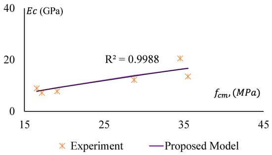 Modulus of Elasticity versus compressive strength of GPC and non-treated CRGPC for the proposed model and experimental results.
