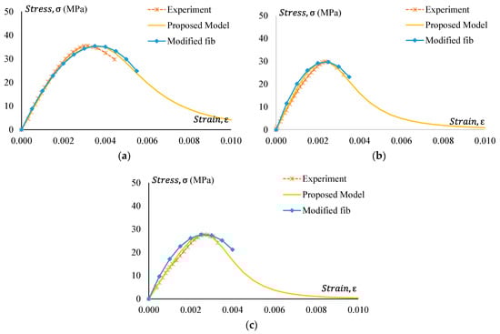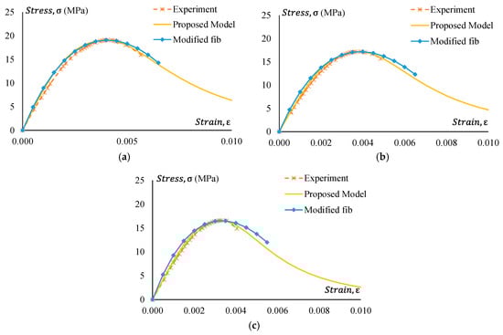 Experimental stress–strain comparison with the proposed model for GPC Mix 2 and non-treated CRGPC mixes. (a) M2 C05 stress–strain comparison with the proposed model and modified fib; (b) M2 C15 stress–strain comparison with the proposed model and modified fib; (c) M2 C25 stress–strain comparison with the proposed model and modified fib.