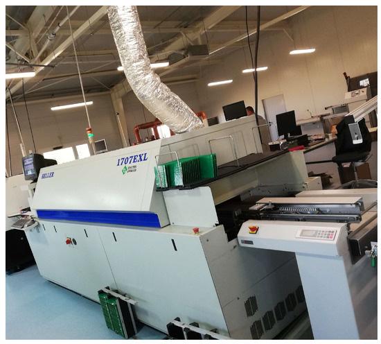 Following electrodeposition, both systems were exposed to a reflowing process using an industrial oven available at MIBATRON S.R.L (https://www.mibatron.ro/ (accessed on 5 December 2023)), a Romanian company specializing in automated PCB assembly. The samples were subjected to a gradual increase in the temperature from 160 °C to 260 °C for 7 min, ensuring the melting of the ternary alloys that have a melting point of 229.4 °C for the Sn-Cu-Ni-DC system and 229.6 °C for the Sn-Cu-Ni-PC system, as has been previously determined [30]. Figure 1 presents the industrial oven used.
