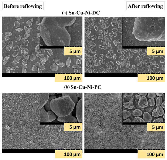 Figure 2 presents the SEM micrographs of the Sn-Cu-Ni-DC and Sn-Cu-Ni-PC systems before and after exposure to reflowing. As illustrated in Figure 2, after reflowing, the grains are partially melted, as the SEM micrographs show. For the alloy prepared under PC conditions, the grains were interconnected with a metallic layer formed as a result of the grains melting.