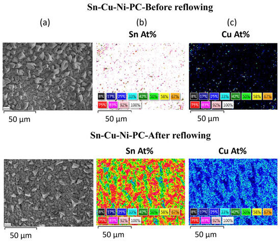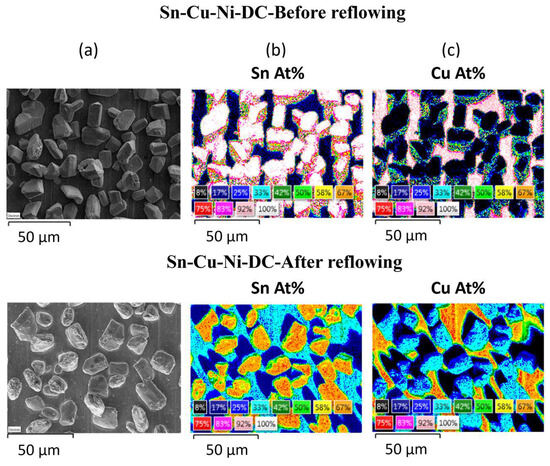 In addition, subjecting the alloys to the reflowing treatment resulted in a modification of their composition. An EDX quantitative analysis was performed before and after reflowing by recording the elemental maps of the main components, as shown in Figure 3 and Figure 4. The variation in the atomic concentrations of Sn or Cu between 8 (black) and 100 at.% (white) is represented in these maps with different colors.