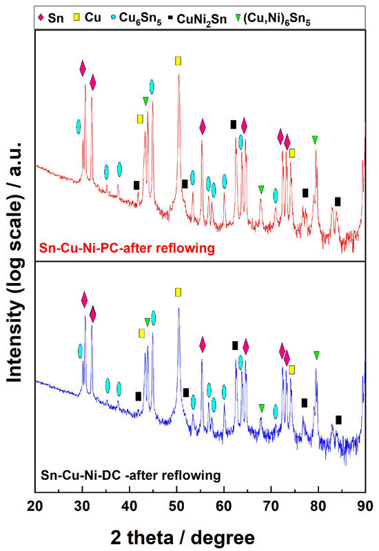 The variations in the alloy’s composition detected through EDX analysis have also been correlated with X-ray diffraction. Figure 5 illustrates the XRD pattern of the Sn-Cu-Ni alloy electrodeposited under DC and PC after exposure to reflowing process. For a better analysis, the vertical axis has been plotted in logarithmic scale. As previously reported, the peaks associated with the Cu substrate (card No. 00-004-0836) and tetragonal Sn (card No. 00-004-0673) have been identified, as well as the ones corresponding to monoclinic Cu6Sn5, (card No.: 01-076-2703), hexagonal (Cu, Ni)6Sn5 (PCD Crystal Data #1905144) and cubic CuNi2Sn intermetallic (ICSD#103068) [31,32,33]. Following the reflow process, the XRD analysis highlighted the increased formation of Cu6Sn5, (Cu, Ni)6Sn5 and CuNi2Sn intermetallic phases. Even when comparing the two systems, the sample obtained under PC exhibits higher intensity in the peaks associated with intermetallic phases.