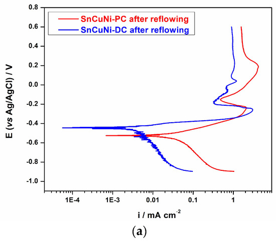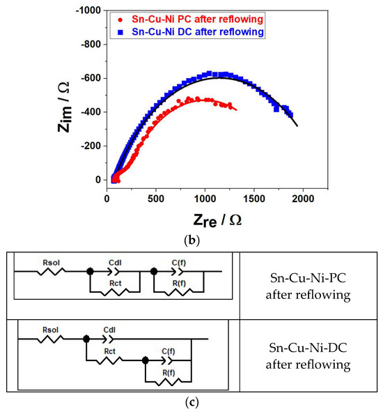 Regarding the corrosion protection, the performance of Sn-Cu-Ni alloy coatings was evaluated by examining the recorded potentiodynamic polarization curves and electrochemical impedance spectra (EIS) in a 0.5 M NaCl solution. A typical polarization graph in semilogarithimic coordinated for the electrodeposited Sn-Cu-Ni alloys under both the DC and PC plating modes following their exposure to the reflowing process is shown in Figure 6. By extrapolating from the Tagel plots, the corrosion potential (Ecorr) and corrosion current density (icorr) were found. It has previously been shown [30] that the as-prepared Sn-Cu-Ni-PC specimens exhibited better anti-corrosive properties compared to the Sn-Cu-Ni-DC ones. Even the corrosion potential was quite similar, Ecorr ~−0.60 V vs. Ag/AgCl, and the corrosion current of Sn-Cu-Ni-PC alloy was much lower (2.7 µA/cm2) than the one of the samples prepared under the direct current mode (9.6 µA/cm2) [30]. Nevertheless, with reflowing, the systems’ anti-corrosive properties were altered. The corrosion potential of Sn-Cu-Ni-DC alloy shifted to more positive values, Ecorr = −0.45 V vs. Ag/AgCl, and the current density, 2.76 µA/cm2, was one order of magnitude lower than the one determined for the PC system, namely Ecorr = −0.53 V vs. Ag/AgCl and icorr = 21.1 µA/cm2, respectively.