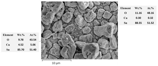 After 72 h of immersion, no signs of corrosion products were observed on the surface of Sn-Cu-Ni-PC system. In contrast, the Sn-Cu-Ni-DC specimen exhibited increased formation of corrosion products. In fact, on the surface of the Sn-Cu-Ni-PC specimen, no corrosion products were detected up to 96 h of immersion. After 168 h of exposure, both systems showed a partial dissolution of the alloy grains. EDX investigations, as illustrated in Figure 8 and Figure 9, revealed the presence of Sn, O, Cu and Cl elements, suggesting the formation of tin oxides and chlorides as corrosion products. Tin, as the primary component of the alloy, acted as an anode in the galvanic couple with Cu from the substrate, leading to its preferential corrosion and resulting in Sn-based corrosion products. Since the spaces between the grains for Sn-Cu-Ni-DC systems are filled with a protective layer of Sn, upon exposure to an aggressive environment, they will form a protective passive film with a spongy plate morphology. Corrosion products with crystal-like morphologies were ascribed to SnO2/SnO. Prior to reflowing, when the Sn-Cu-Ni-PC system was exposed to 168 h of immersion in 0.1 M NaCl, corrosion products as crystals and spongy plates appeared after the first 24 h of exposure. Subsequently, after 168 h of conditioning, the initially formed film became more compact and covered the surface of the deposit, acting as a barrier against aggressive chloride ions [30]. Upon exposure to the reflowing process, the formation of a compact film on the alloy was no longer evident when the system was immersed in a 0.1 M NaCl solution. Therefore, there was a transformation in the morphology of the corrosion products, which could be associated with the modification of the anti-corrosive properties of the Sn-Cu-Ni alloys after exposure to the reflowing process.