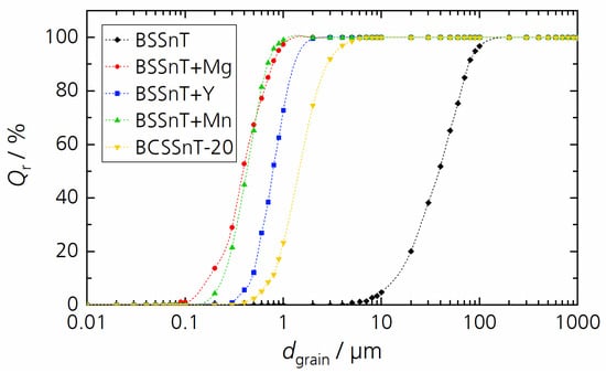 For the further investigation of the phase composition and electrical properties, only sintered bulk ceramics with a monomodal distribution of fine grains were selected and are summarized in Table 1 (BSSnT for reference). Their monomodal grain size distribution curves are shown in Figure 2.