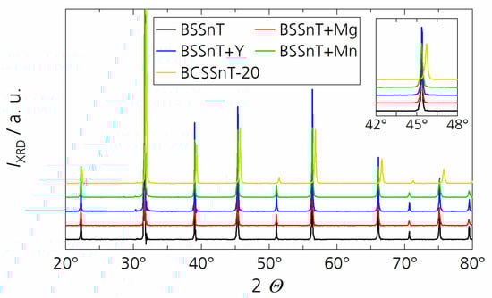 The XRD patterns shown in Figure 3 indicate that pure perovskite phases were formed within the bulk ceramic samples with no occurrence of secondary phases. According to the Inorganic Crystal Structure Database (ICSD), the XRD pattern of all samples except BCSSnT-20 fit with the comparable material composition of Ba0.6Sr0.39Sn0.26Ti0.74O3 (ICSD file no. 01-077-9432), indicating a cubic crystal structure (Pm3m, 211 space group, a = 3.985 Å). The XRD pattern of BCSSnT-20 is in accordance with the peaks of the material composition of Ba0.6Sr0.4TiO3 (ICSD file no. 00-034-0411) with a cubic crystal structure (Pm3m, 211 space group, a = 3.965 Å). The inset of Figure 3 shows the XRD peaks at 2θ values between 42° and 48° for all samples. The modification of BSSnT with calcium caused a shift of the reflections in BCSSnT-20 to higher diffraction angles. These shifts can be explained by the substitution of Ba2+ ions (ionic radius: 175 pm) by Ca2+ ions (ionic radius: 148 pm) [], which leads to a decrease in the lattice parameter and thus to higher diffraction angles.