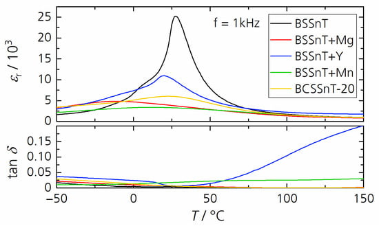 Temperature dependence of the relative permittivity εr and dielectric loss factor tan δ measured at 1 kHz for BSSnT (black), BSSnT + Mg (red), BSSnT + Y (blue), BSSnT + Mn (green) and BCSSnT-20 (yellow).