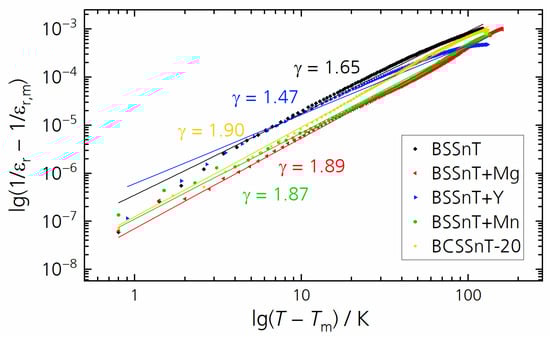 where C is the Curie–Weiss constant, γ is the diffuseness coefficient with a value between 1 (for an ideal ferroelectric material) and 2 (for an ideal relaxor ferroelectric material). The plots of versus and their fitting curves at 1 kHz for the investigated samples are shown in Figure 5. The values of γ are in the range of 1.47–1.90, which corresponds to the diffuse phase transition caused by the existence of different states of polarization and hence different relaxation times in different regions []. The dielectric data of the investigated samples are summarized in Table 2. The addition of grain-growth inhibitors and Ca modification reduced the dielectric permittivity due to the decreased grain size. With the exception of the Y addition, the investigated grain-growth inhibitors showed no significant influence on the diffuseness of the phase transition.