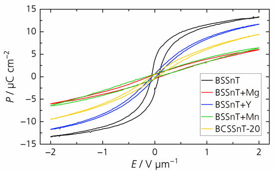 Hysteresis loops of polarization in dependence of the electric field varying from −2 to 2 V µm−1 measured at 20 °C and 10 Hz are presented in Figure 6. The samples prepared using grain-growth inhibitors showed a decreased maximum polarization Pm and a decreased remanent polarization Pr compared to pure BSSnT, which is related to their reduced grain size []. The addition of MgO to BSSnT led to a 55% decrease in the maximum polarization from Pm = 13.4 µC cm−2 to Pm = 6.1 µC cm−2, whereas the modification of BSSnT with Ca only reduced the maximum polarization by 30% to Pm = 9.5 µC cm−2. BCSSnT-20 therefore appears to be qualified for future multilayer ceramic fabrication. The ferroelectric characteristics of all studied compositions are summarized in Table 3.