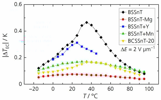 Electrocaloric temperature change |ΔTEC| depending on temperature T for BSSnT (black), BSSnT + Mg (red), BSSnT + Y (blue), BSSnT + Mn (green) and BCSSnT-20 (yellow) measured at ΔE = 2 V µm−1.