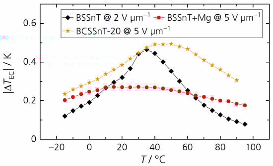 Electrocaloric temperature change |ΔTEC| depending on the temperature T for BSSnT (black) measured at ΔE = 2 V µm−1, and BSSnT + Mg (red) and BCSSnT-20 (yellow) measured at ΔE = 5 V µm−1.