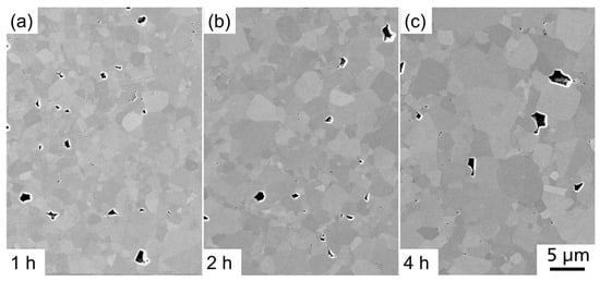Our variations of sintering time with a constant sintering temperature of 1350 °C only slightly influenced the microstructure of BCSSnT-20 (shown in Figure 9). With an increase in sintering time from 1 h to 4 h, the grain size increased from 1.5 µm to 1.9 µm (Figure 10), accompanied by an increase in porosity from 0.6% to 1.0%.