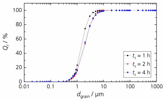 Cumulative distribution Qr of grain size dgrain for BCSSnT-20 sintered at 1350 °C for 1 h (black), 2 h (red) and 4 h (blue).