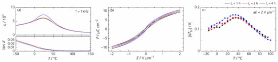 The electrical properties were marginally improved by increasing the sintering time (Figure 11). The maximum relative permittivity rose negligibly with Tm remaining unchanged. The slim hysteresis loops indicate that the samples showed relaxor-like behavior, and the temperature-dependent behavior of the remanent polarization indicates that the samples underwent a diffuse phase transition. In addition, the remanent polarization increased faintly with increasing sintering time and so did the electrocaloric temperature change. Results of the characterization are summarized in Table 4 (for the relative permittivity εr measured at different frequencies, the corresponding diffuseness coefficient γ and the temperature-dependent remanent polarization, see Figures S2–S4.) In conclusion, varying the sintering time affected the grain size slightly and thus only moderately changed the electrocaloric properties.