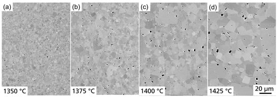 In the second step, we investigated the influence of the sintering temperature TS with a constant sintering time of 1 h. Figure 12 presents the microstructure and Figure 13 the grain size distribution of BCSSnT-20 sintered at sintering temperatures up to 1425 °C. Increasing the sintering temperature led to a grain coarsening from 1.5 µm at 1350 °C to 3.6 µm at 1375 °C, 4.7 µm at 1400 °C and up to 7.3 µm at 1425 °C. Simultaneously, the porosity increased from 0.6% to 2.2%. Along with the increase in the sintering temperature and grain size, the maximum relative permittivity increased significantly with a shift of the temperature of maximum permittivity towards lower temperatures (shown in Figure 14a). Moreover, the peak of relative permittivity became shaper and the diffuseness coefficient γ decreased from 1.90 to 1.72, indicating that the phase transition is no longer suppressed and thus less diffuse in samples with coarse grains []. The remanent polarization increased with increasing sintering temperature and grain size. With an increasing grain size, the number of low-permittivity grain boundaries is reduced, resulting in less polarization discontinuity on the grain surface and thus improved polarization []. The maximum electrocaloric temperature change |ΔTEC| increased from 0.15 K at 35 °C to 0.37 K at 20 °C under an electric field change of 2 V µm−1, which can also be explained by the dependency of the EC effect on the grain size [,,]. Results of the characterization of the BCSSnT-20 samples in dependence of their sintering temperature are summarized in Table 5 (for the relative permittivity εr measured at different frequencies, the corresponding diffuseness coefficient γ and the temperature-dependent remanent polarization see Figures S5–S7.) Additionally, the typical values of the directly measured electrocaloric temperature change published for selected BaTiO3-based materials are shown in Table 6. The sample of BCSSnT-20 sintered at 1425 °C was in good agreement with previously published results, exhibiting an electrocaloric strength of 0.19 10−6 K m V−1. Simultaneously, the maximum of the ECE occurred around room temperature.