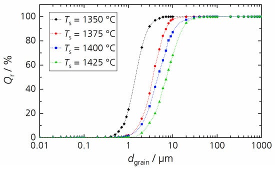The cumulative distribution Qr of grain size dgrain for BCSSnT-20 sintered for 1 h at 1350 °C (black), 1375 °C (red), 1400 °C (blue) and 1425 °C (red).