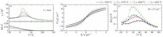 (a) Temperature dependence of the relative permittivity εr and dielectric loss factor tan δ measured at 1 kHz; (b) hysteresis loops of the polarization P in dependence of the electric field E measured at 20 °C and 10 Hz; (c) the electrocaloric temperature change |ΔTEC| depending on the temperature T for BCSSnT-20 sintered for 1 h at 1350 °C (black), 1375 °C (red), 1400 °C (blue) and 1425 °C (green).