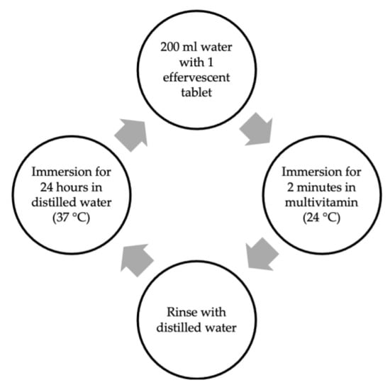 The samples of each micro-hybrid resin composite were randomly divided into two subgroups based on the immersion medium (Redoxon Triple Action effervescent and distilled water). Over 30 days, the control samples were kept in distilled water that was refreshed daily. The experimental samples were immersed in 200 mL of water (24 °C) with 1 effervescent tablet for 2 min a day in 24 h intervals between the immersion cycles (Figure 1).
