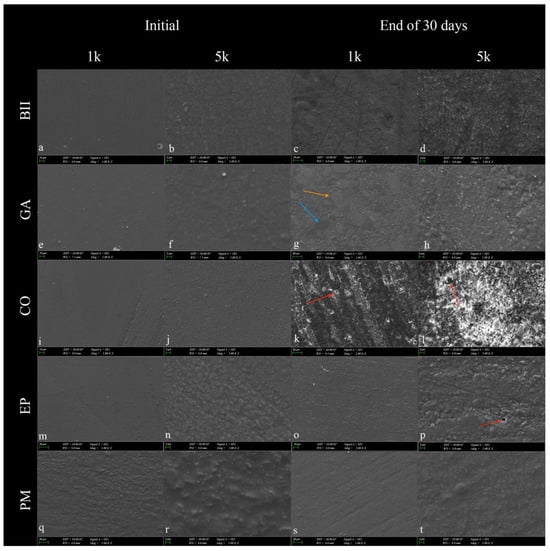 SEM images of micro-hybrid resin composites at 1000 (1k) and 5000 (5k) magnifications were taken before and after exposure to the multivitamin for 30 days. (a–d): Beautifil II; (e–h): Geanial Anterior; (i–l): Charisma Opal; (m–p): Estelite Posterior; (q–t): Pergamon. In resin composites, nanoclusters (orange arrow) and prepolymerized fillers (blue arrow) became prominent following exposure to the vitamin solution. Signs of fallout of the fillers and decomposition of the matrix were observed following immersion in the vitamin solution (red arrow). Clusters of debris formed from loose mineral particles were observed in (d,h,l,p,t). The filler sizes in the images were consistent with the manufacturer’s information on the content (Table 1).