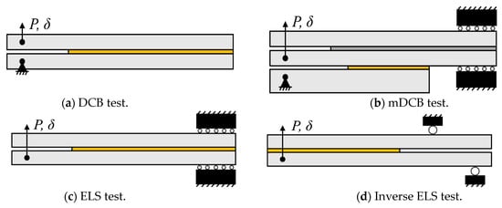 As such, alternative tests must be developed since the ELS tests still present excessive friction between the unbonded beams and instabilities associated with the crack propagating in the direction of the highest flexural moment. A novel method was devised by Budzik and Jummel [,], the inverse ELS (I-ELS) test—Figure 1d—which is inherently a stable concept. This is due to the crack propagating in the direction of the highest flexural moment, improving on the fact that the ELS test was simply conditionally stable.
