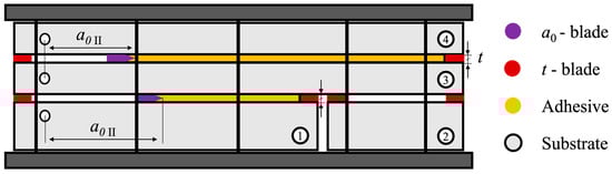 Two thin 0.1 mm-thick razor blades (“a0-blade” in Figure 3) were positioned in the middle of the bond line to promote the formation of a sharper initial crack, a0. Calibrated tapes (“t-blade” in Figure 3) were used to set an adhesive thickness (t) of 0.2 mm. All blades were coated with a demolding agent to prevent adhesion.